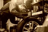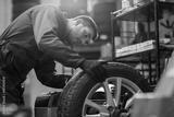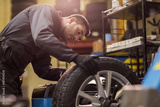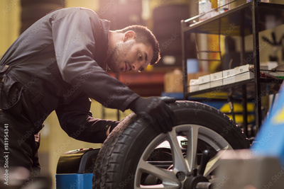 auto mechanic balancing car wheel at workshop