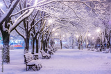 Amazing winter night landscape of snow covered bench among snowy trees and shining lights during the snowfall. Artistic picture. Beauty world.
