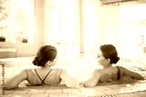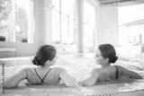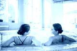 Fit girls in bikini enjoying warm and delicate water splashes in whirlpool