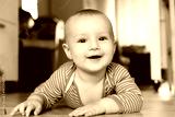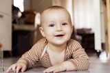 Happy, laughing baby lying on tiled floor at home for child development, wellness and growth. Cheerful active little infant kid training physical skills, smiling, learning to crawl, playing and relax.