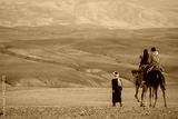 Camel caravan going through the sand dunes in the Desert, Morocco