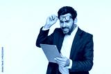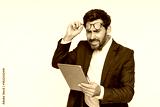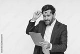 Portrait, confused and business man with tablet in studio isolated on white background. Ceo face, professional boss and angry Caucasian male entrepreneur with touchscreen technology.