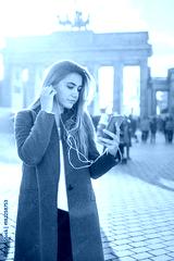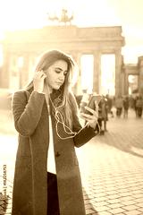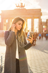 Beautiful young woman listening to music on mobile phone while standing near Brandenburg gate in Berlin.