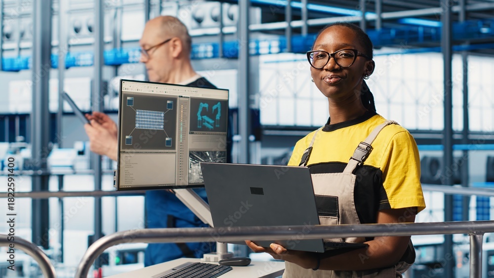 Smiling engineer overseeing smart factory, looking at collected metrics on laptop screen. Happy technician on platform in industry 4.0 industrial plant equipped with sensors using notebook, camera A