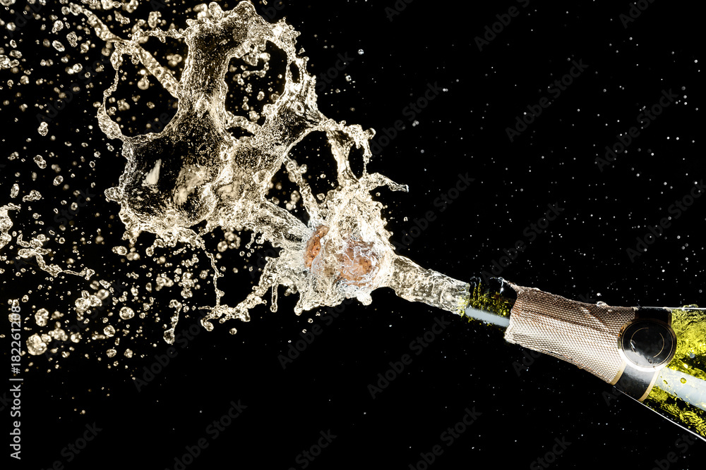 Celebration and holiday theme. Champagne splashes on black background