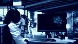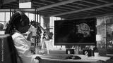 Software developer wearing headphones using computer at home for artificial intelligence computing simulating human brain. IT expert listening music and working with AI deep neural networks, camera A