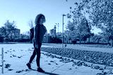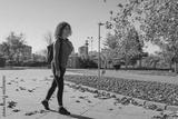 A middle-aged woman with a backpack on her back walks through the park on a sunny autumn day.