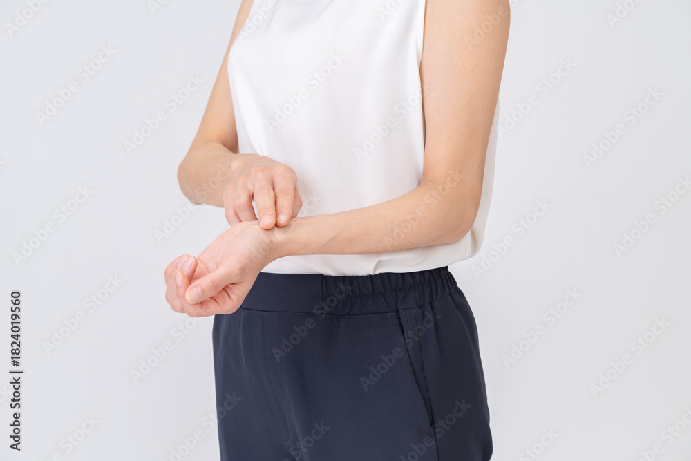 手首の痛みを訴える女性|ヘルスケア・腱鞘炎・体の不調イメージ