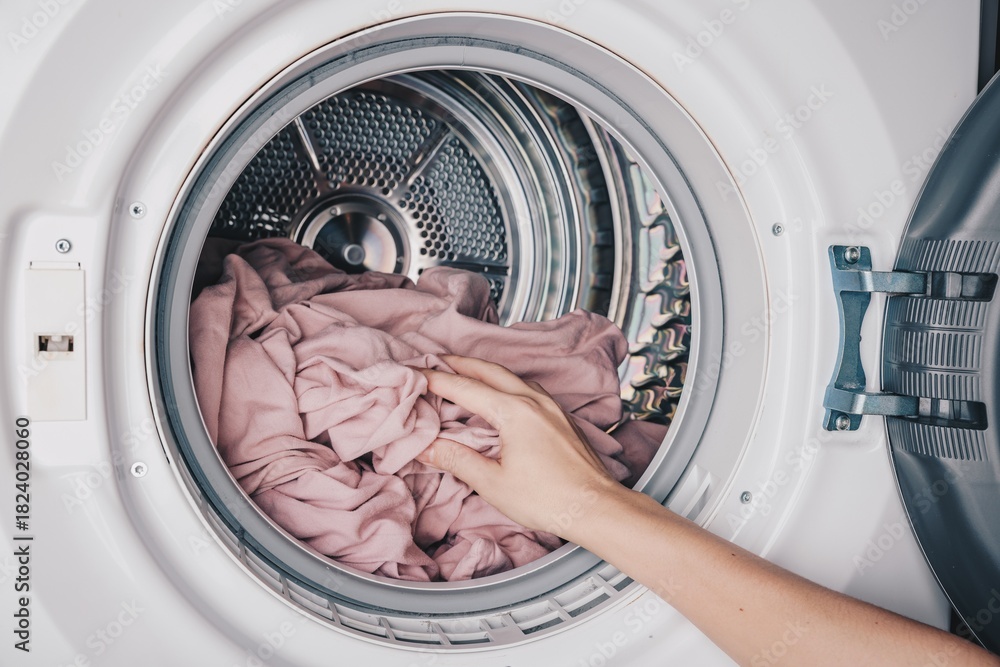A Close-Up View of a Hand Reaching into a Washing Machine Drum or Dryer Filled with Soft, Freshly Washed Fabric in a Light Pink Color