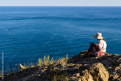Girl sits on the edge of a cliff and looks at the sea