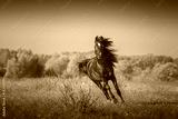 Black Arabian horse runs forward on the trees and sky background in autumn