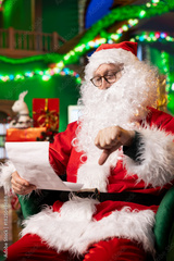 Disappointed Santa Claus gives thumbs down after reading letters from children on naughty list. Irked Father Christmas looking at wish list, doing negative hand gesture, upset with kids who did wrong