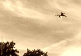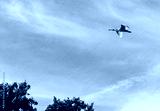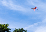 Pink Roseate Spoonbill bird flying against blue sky in Costa Rica in the Tortuguero National Park