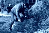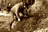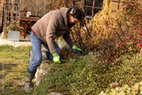 Older woman weeding garden bed during late autumn, seasonal garden maintenance before winter