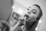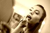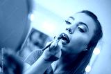 Beautiful girl applying lip liner to lips.