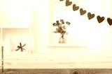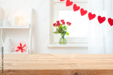 Valentine day empty wooden table on decorated with red hearts and flowers blurred window interior background
