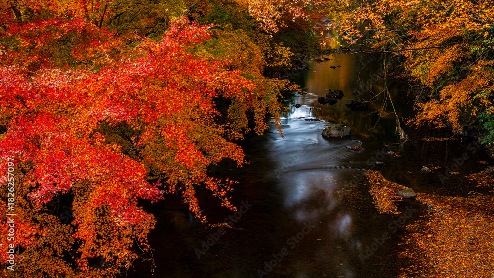 紅葉に包まれる川 横宿橋の紅葉 絶景