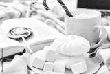 Winter mood composition Christmas Day at home with cup of hot cacao or coffee with marshmallow sweets candy cane and lollipop read book films at laptop work in the bed with wool knitted plaid New Year