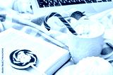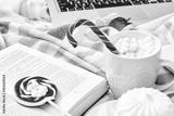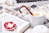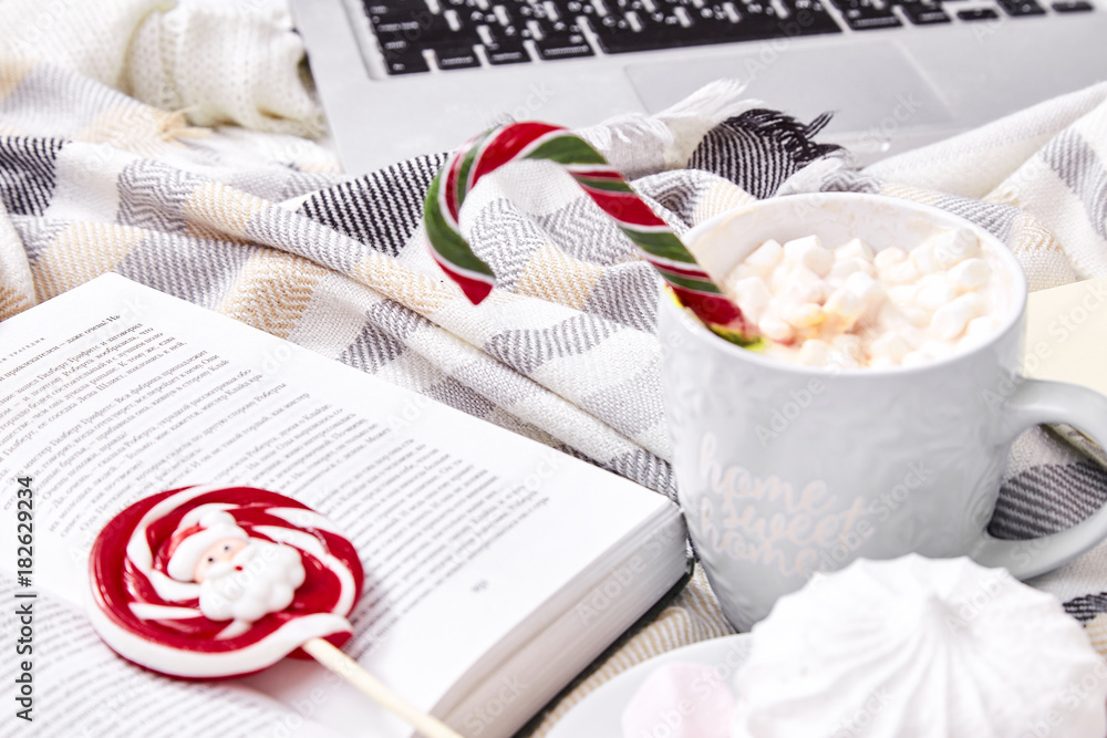 Winter mood composition Christmas Day at home with cup of hot cacao or coffee with marshmallow sweets candy cane and lollipop read book films at laptop work in the bed with wool knitted plaid New Year