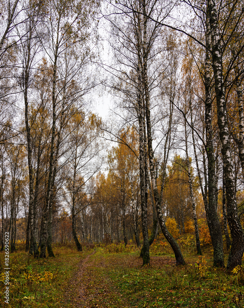 Autumn forest with tall birch tree trunks and fallen yellow leaves on the ground. Natural seasonal scenery, nature background.