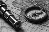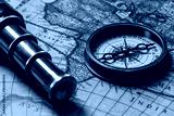 Retro compass with old map and spyglass