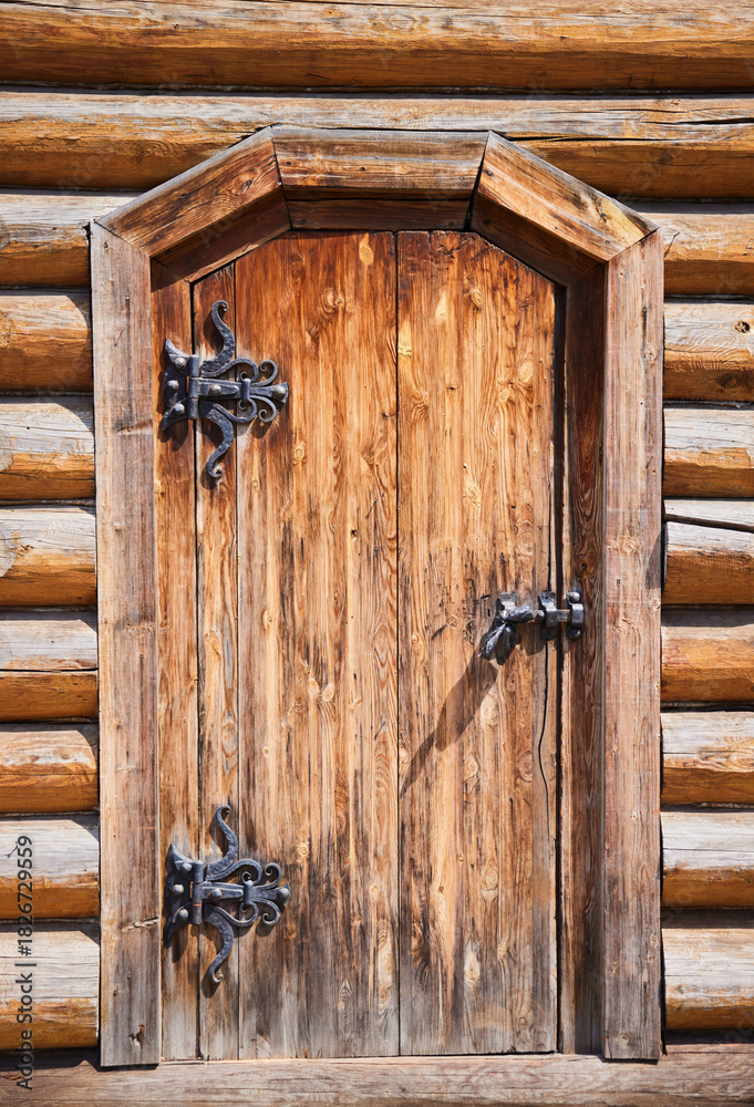 A door in a wooden log house with wrought iron details