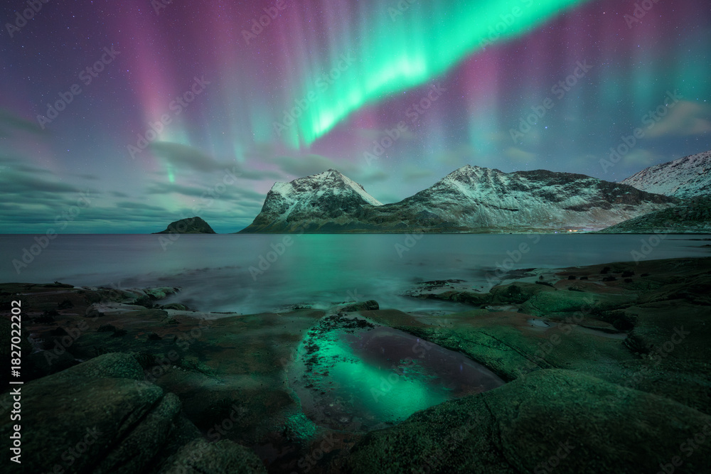 Aurora borealis on night starry sky with vibrant green and pink colors, reflection on water near the rocky shore in winter. Northern lights over beach and snowy mountains in Lofoten Islands, Norway