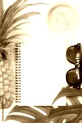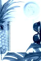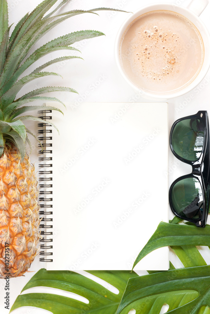 Tropical top view summer botanical concept still life sunglasses pineapple coffee cup notebook frame with monstera liana, vine, palm leaves and plumeria frangipani flower flat lay layout