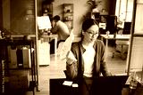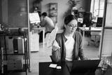 Young Asian woman working at desk using laptop, holding paper fan and wearing eyeglasses, sitting in modern office with young Asian man working at computer in background