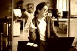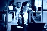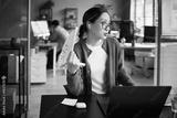 Young adult Asian woman sitting at desk working on laptop, holding handheld fan and talking, wearing wireless earphones, office environment with coworker in background