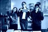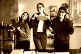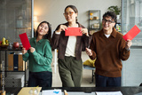 Three young adult Asian men and women standing in modern office holding red envelopes, smiling and looking at camera, business documents and laptop visible on desk in foreground