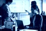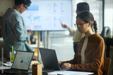 Young Asian businessmen and businesswomen working in modern office, young Asian woman using laptop at desk while two young Asian colleagues discussing data on digital screen in background
