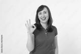 Smiling attractive middle aged woman showing thumbs up, okay. Isolated. Copy space