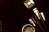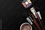 Cosmetic products on black background and make up tools. Top view and mock up. Copy space.