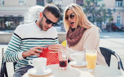 Shopping time. Young couple enjoying in a coffee after shopping. Consumerism, lifestyle concept