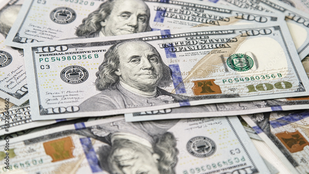 Close-up of multiple hundred dollar bills stacked together, showcasing intricate designs, textures, and vibrant colors, representing wealth and financial transactions in a modern economy