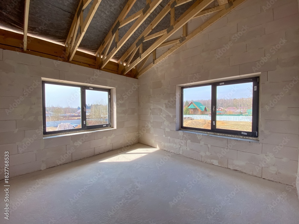 Interior View of an Unfinished Room Showcasing Natural Light Through Windows and Exposed Structure in a Modern Construction Setting