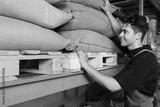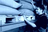 Barista at warehouse choosing a bag with beans. Young male at the shelfs in warehouse with bags full of beans.