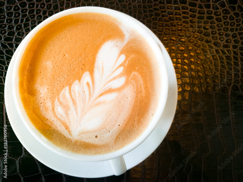 Hot mocha coffee or cappuccino with luxury pattern on the leather table