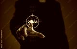 A hand points at the glowing 2026 target displayed on a digital interface, surrounded by upward green arrows and growth bars, symbolizing future goals, expansion, strategic planning, and rising perfor