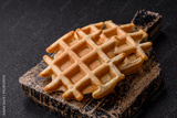 Belgian waffles, a healthy sweet breakfast dessert, food background. Belgian waffles