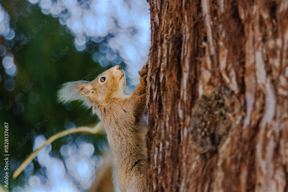 A squirrel is sitting on a tree branch. The branch is covered in moss.