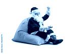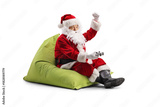 Happy Santa claus holding a joystick and cheering with hand