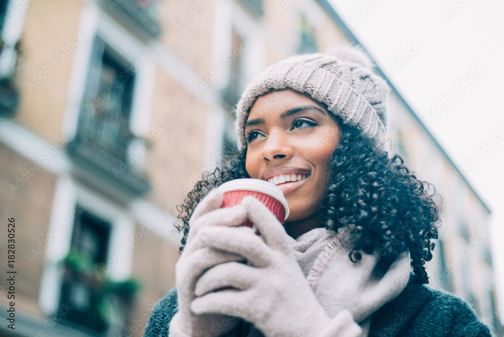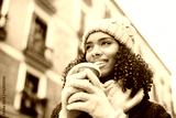 Young black woman drinking coffee wandering in the streets of Madrid on winter