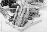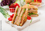Club sandwich - panini with ham, cheese, tomato and herbs. Top view