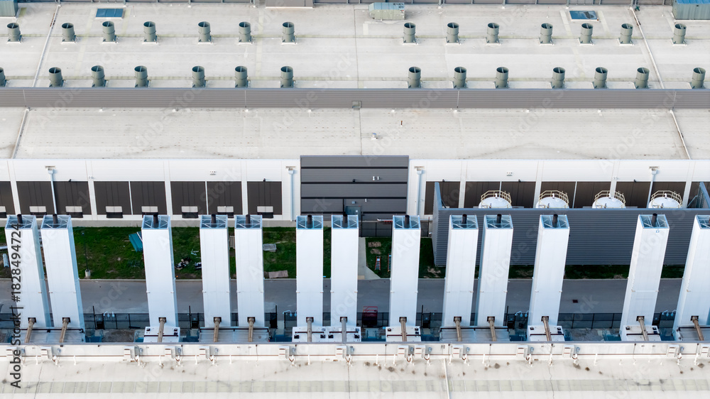 The rooftop infrastructure of a large data center, with numerous ventilation, chiller and cooling systems.