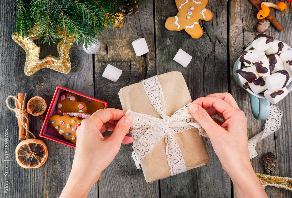 Top view female hands decorating gift with vintage lace ribbon on wooden table with gingerbred cookies, christmas tree branches with decor, cup of cocoa with murshmellows. Selective focus.