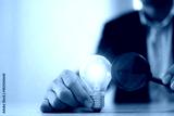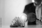 Businessman's hand is choosing light bulb for business creativity plan to goal or creative idea innovation or analyzing marketing data management and target growth or human resources.