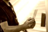 Hand scanning proximity ID card on reader access control system to security door unlock for identity or verification identify for safety detect fingerprint scan or check attendance.