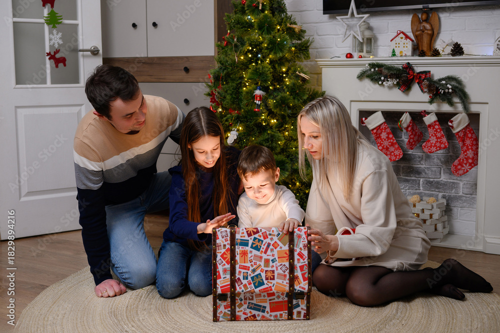 Family sits on floor near decorated Christmas tree, unwrapping magical gift with lights shining from it. Christmas celebration, children, parents eagerly opening large gift, creates magical atmosphere